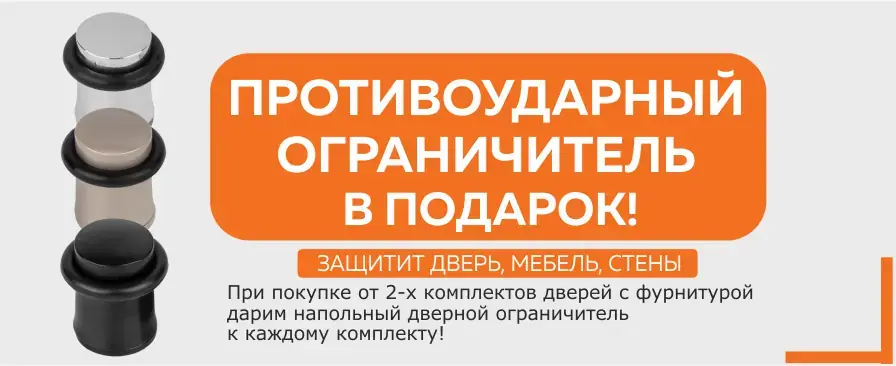 К каждому комплекту двери дарим противоударный дверной напольный ограничитель Марлок стоимостью 750 руб.