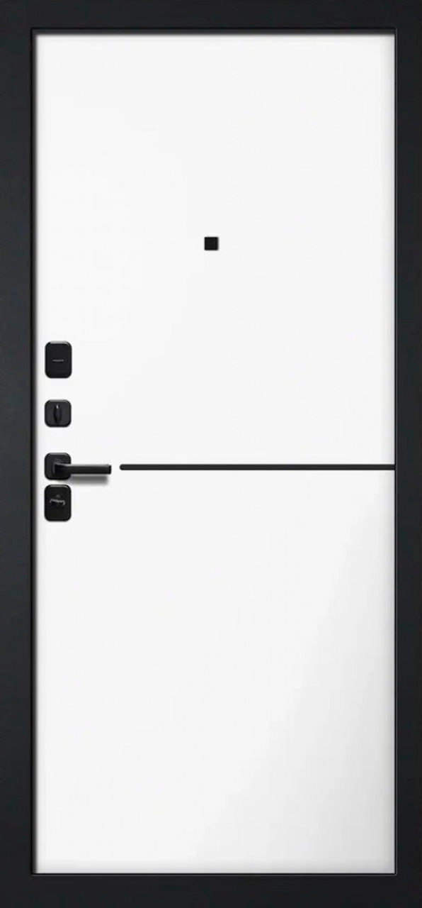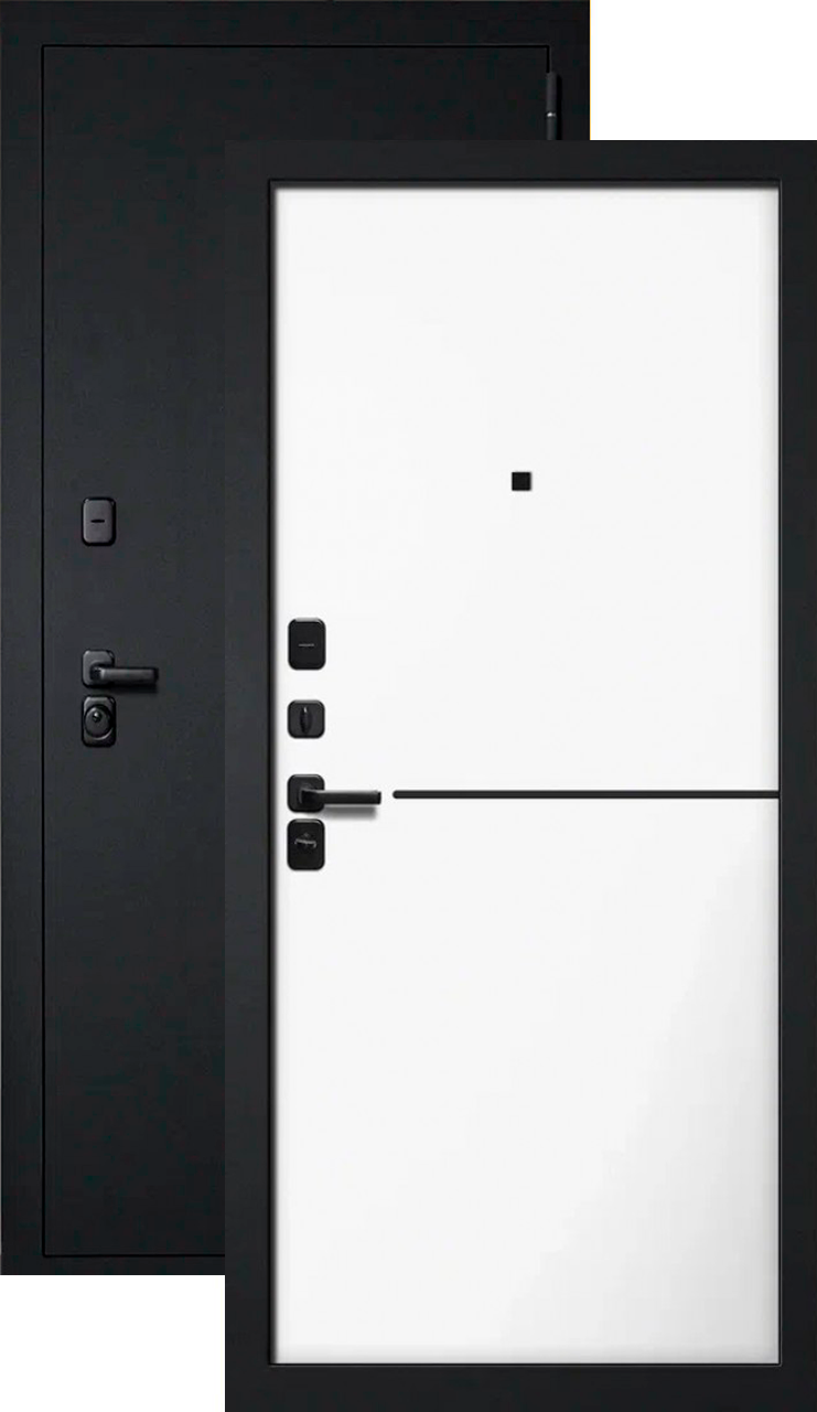 Повышенной надежности российская дверь со стильной внешней отделкой муар черный с блестками и красивой декоративной панелью толщиной 10 в цвете белый. Прекрасно подойдет для установки в квартиру. Солидная модель, которая хорошо защитит и подчеркнет статус.