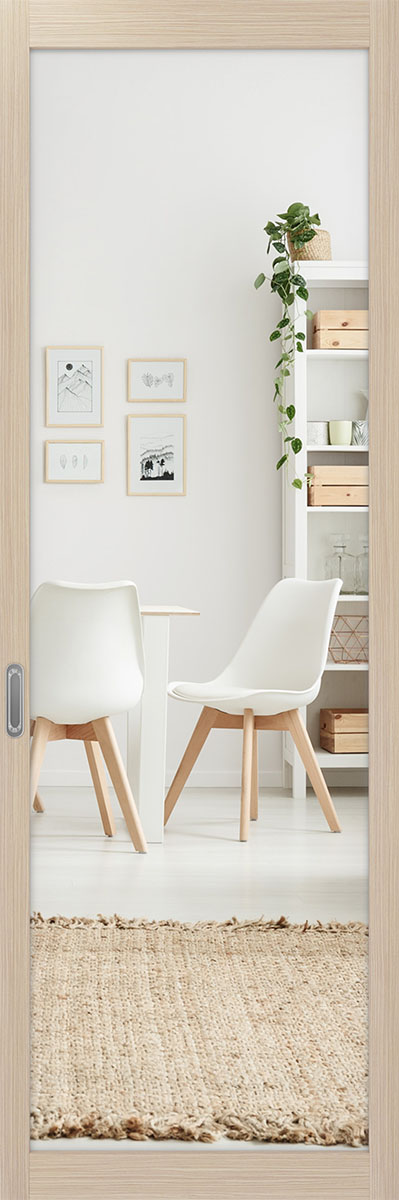 Такой вариант можно считать очень практичным и универсальным, поскольку подходит он к самым разным интерьерам в оформлении помещений. Часто такую дверь ставят в небольших комнатах, чтобы зрительно увеличить пространство.