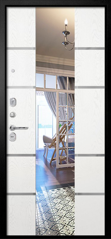 Повышенной надежности российская дверь с большим зеркалом на внутренней панели со стильной внешней отделкой муар черный. Прекрасно подойдет для установки в квартиру. Солидная модель, которая хорошо защитит и подчеркнет статус.