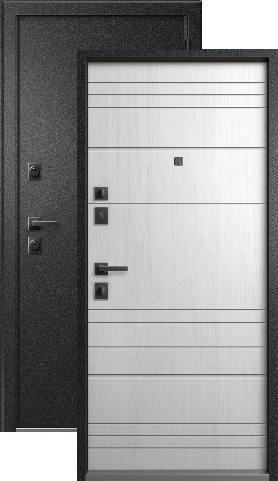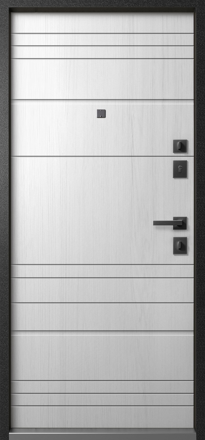 Повышенной надежности российская сейф-дверь со стильной внешней отделкой муар черный и красивой декоративной панелью толщиной 16 в цвете белый снег. Прекрасно подойдет для установки в квартиру. Солидная модель, которая хорошо защитит и подчеркнет статус.