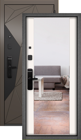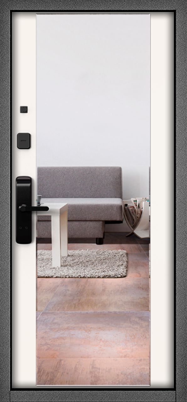 Повышенной надежности российская дверь с большим зеркалом на внутренней панели со стильной внешней отделкой холст вулканический/черный муар. Прекрасно подойдет для установки в квартиру. Солидная модель, которая хорошо защитит и подчеркнет статус.