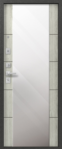 Повышенной надежности российская дверь с большим зеркалом на внутренней панели со стильной внешней отделкой муар черный. Прекрасно подойдет для установки в квартиру. Солидная модель, которая хорошо защитит и подчеркнет статус.