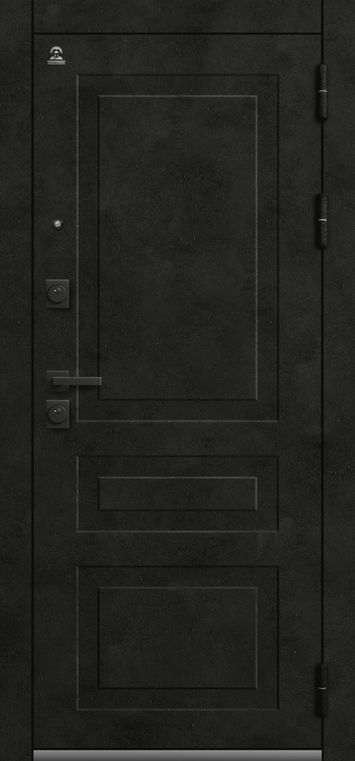 Повышенной надежности российская сейф-дверь с большим зеркалом на внутренней панели со стильной внешней отделкой муар черный/бетон темный. Прекрасно подойдет для установки в квартиру. Солидная модель, которая хорошо защитит и подчеркнет статус.
