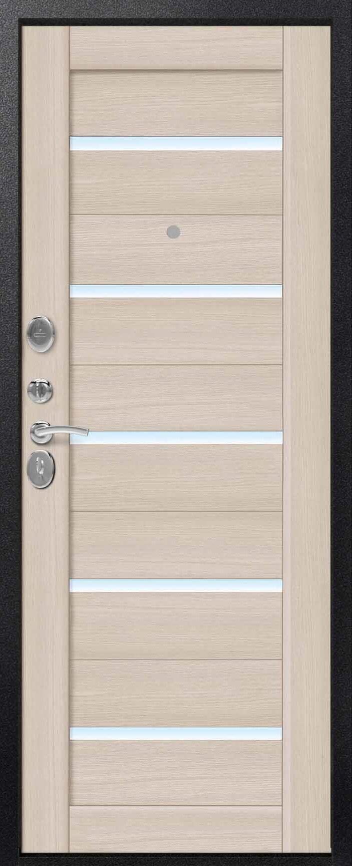 Качественная российская дверь со стильной внешней отделкой муар черный и красивой декоративной панелью толщиной 10 в цвете лиственница светлая. Прекрасно подойдет для установки в квартиру. Надежная модель, которая прослужит долгие годы.